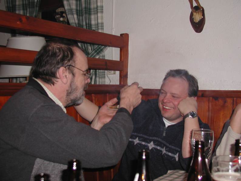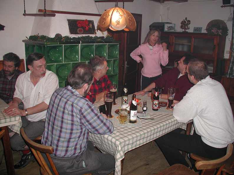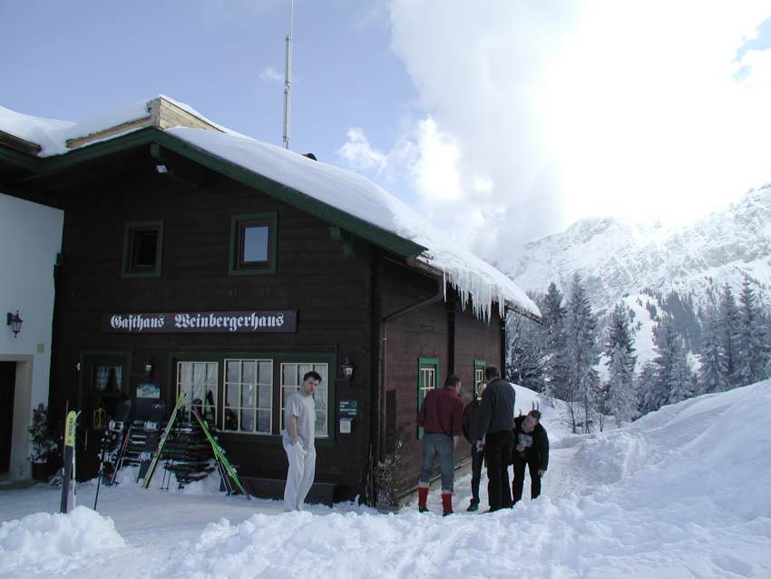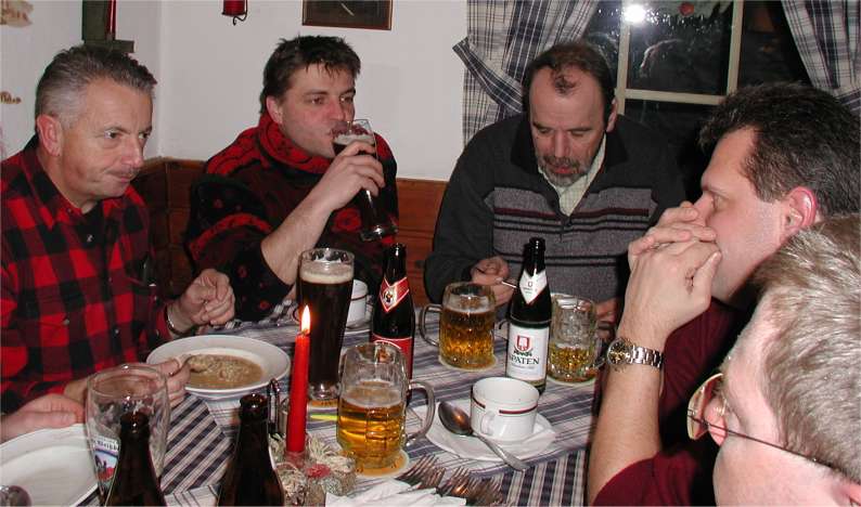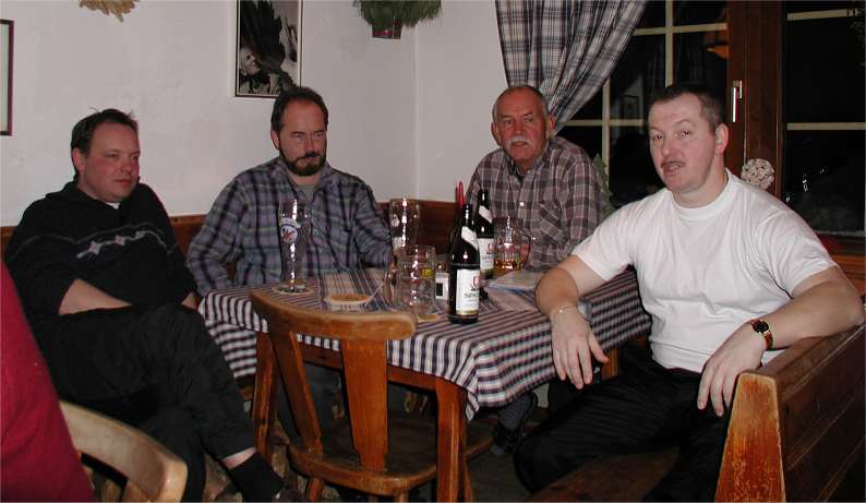 | Gemeinsames Hüttenwochenende auf der Weinbergeralm (bei Kufstein) im Feb. 2003 War ne fetzn-Gaudi mit super Stimmunmg ! Nur haben uns die Ösis abgezockt- 25Euro pro Person für den Lift !!! Die Hütte hatten wir bis auf die Tourengänger unter Tags völlig für uns alleine........ |