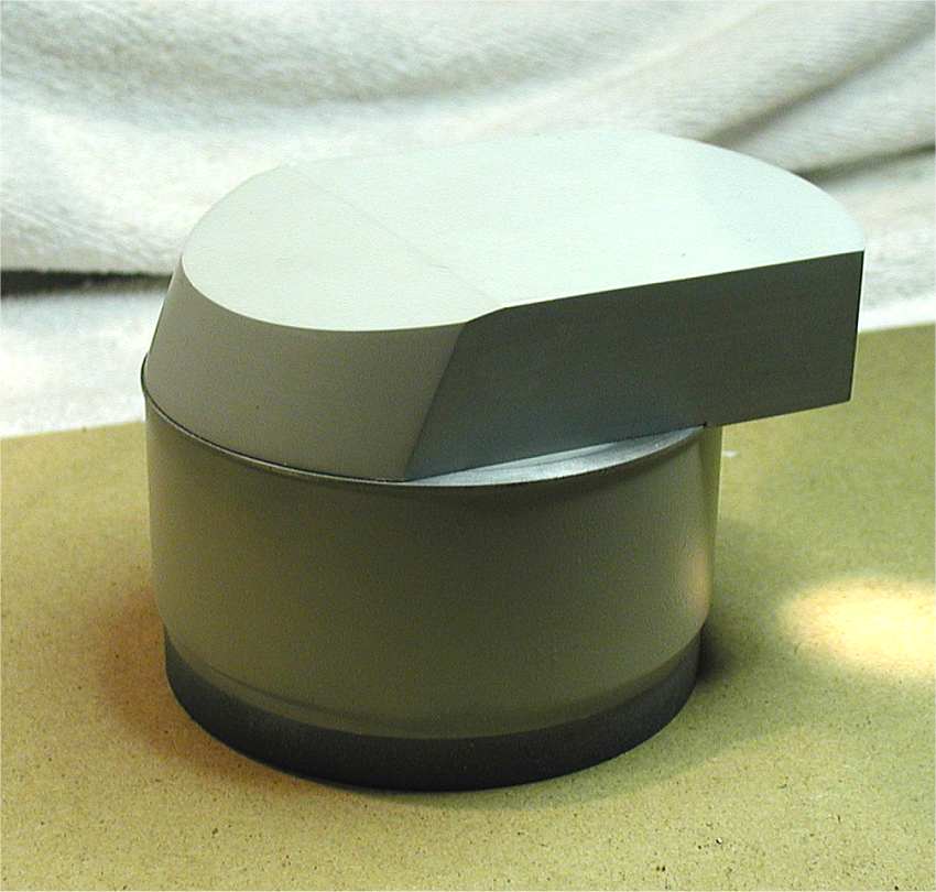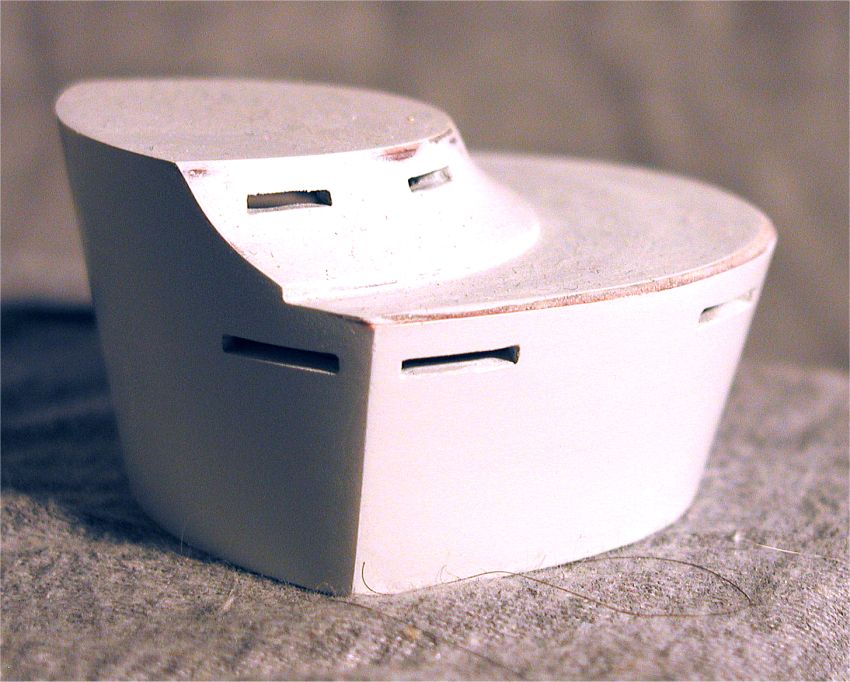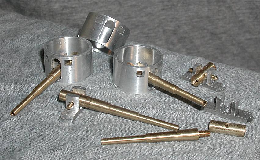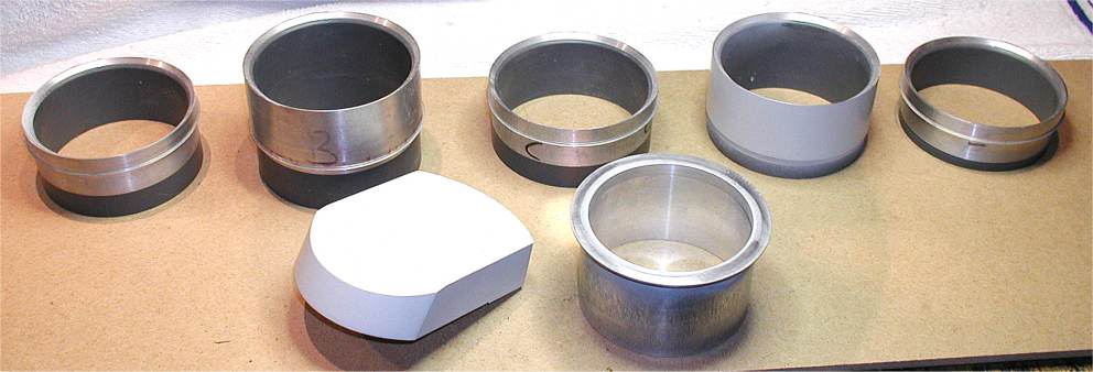 Anfang 2002 Aus Alu und PVC-Rohr gedrehte Pivots (drehbare Innenringe) und Barbetten(fester Aussenring) . Die Turmhaube ist nur ein Positivmodell zum Abformen |