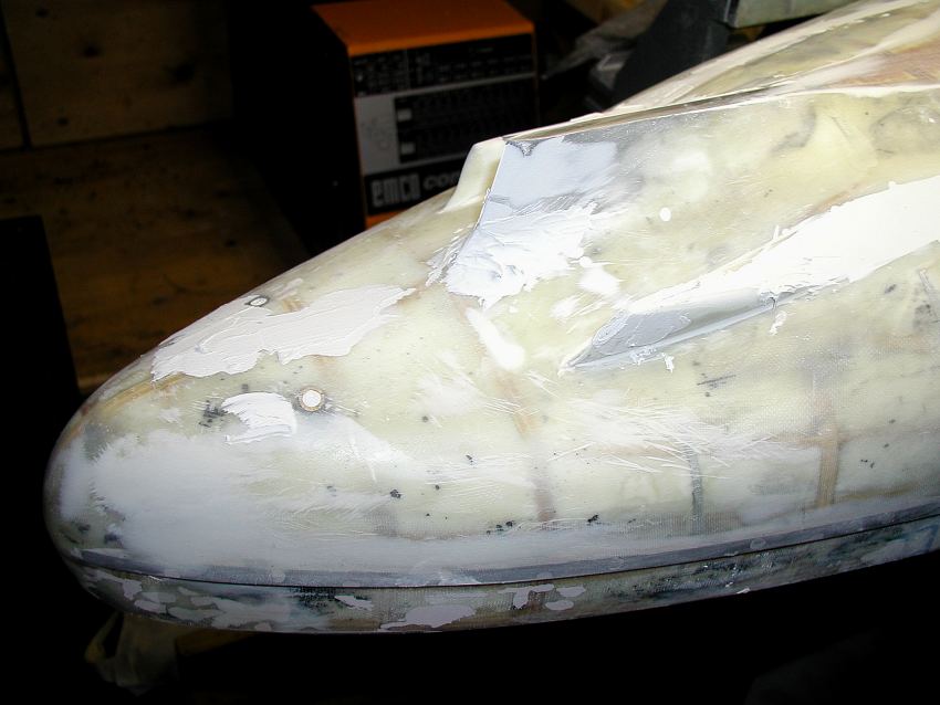 Ab Ende 2000: Die Entscheidung - Dieser Rumpf soll nur als Urmodell dienen. Sicher ist sicher ! Nicht vorzustellen wenn ich einen fehlerhaften Rumpf hätte !!! Ein abgeformter Rumpf ist nun mal am leichtesten, stabilsten und sichersten. Allerdings hat das einen größeren Arbeitseinsatz und mehr Materialverbrauch (Negativform) zur Folge , aber nur das Ergebnis zählt wirklich. |