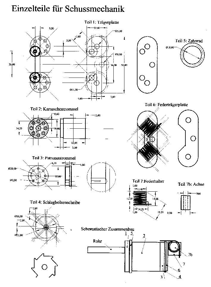 Anfang 2003 Die Mechanik für die grossen 30,5cm-geschütztürme hab ich auch schon konstruiert. Gottseidank war ich in Technisch Zeichnen schon immer recht gut.Wenn dies realisiert ist, habe ich 5 Geschütztürme mit je 2 voll funktionsfähigen 8-schüssigen Rohren. Das wird eine Gaudi wenn ich dann eine volle Breitseite loslasse ! Die Funktion beinhaltet nicht nur den Knall sondern auch optische Wirkung mit Feuer und Rauch aus den Rohren !!! |