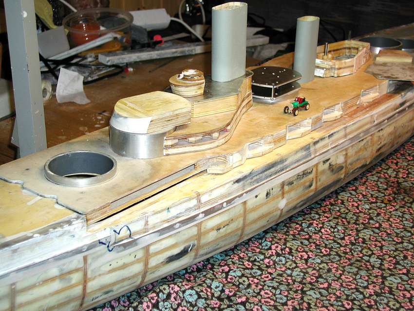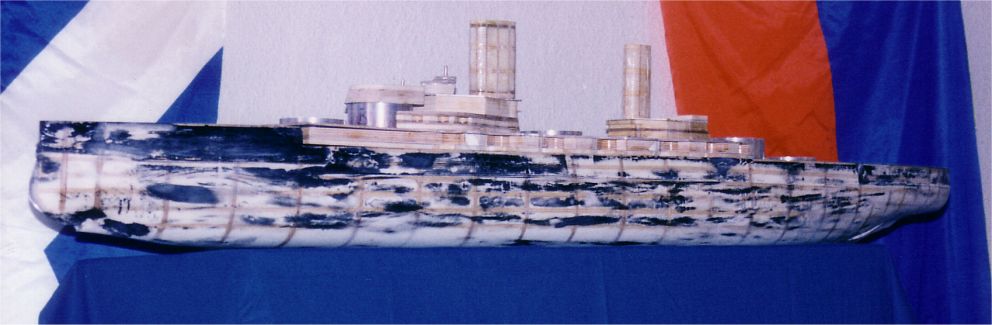 Hier die vorderen Aufbauten und der Gefechtskommandostand. (ca. 2001) Wie gehabt alles in Schichtbauweise, der Kern ausgesägt. So werden alle größeren Aufbauteile gefertigt, die kleineren Details werden aus 0.2mm Messingblech gefertigt. |