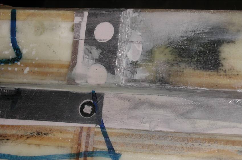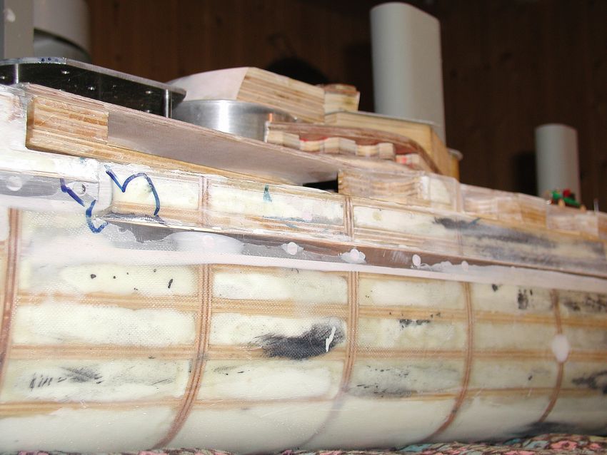 Der Rumpf mittschiffs.Besonderheit : Keine Beplankung. Die Zwischenräume wurden mit selbstgemixter Spachtelmasse (Styroporkugeln, Microballons und Epoxy) ausgefüllt,alles in Form geschliffen und aussen und innen mit wenig Glasfasermatten überzogen, durch diese Bauweise dienen die ohne Abzug ausgeschnittenen Spanten jeder einzelne als Schablone für die richtige Rumpfform - ich finde das genauer als mit Beplankung, die auch eine Schweinearbeit ist und Risiken hat. |