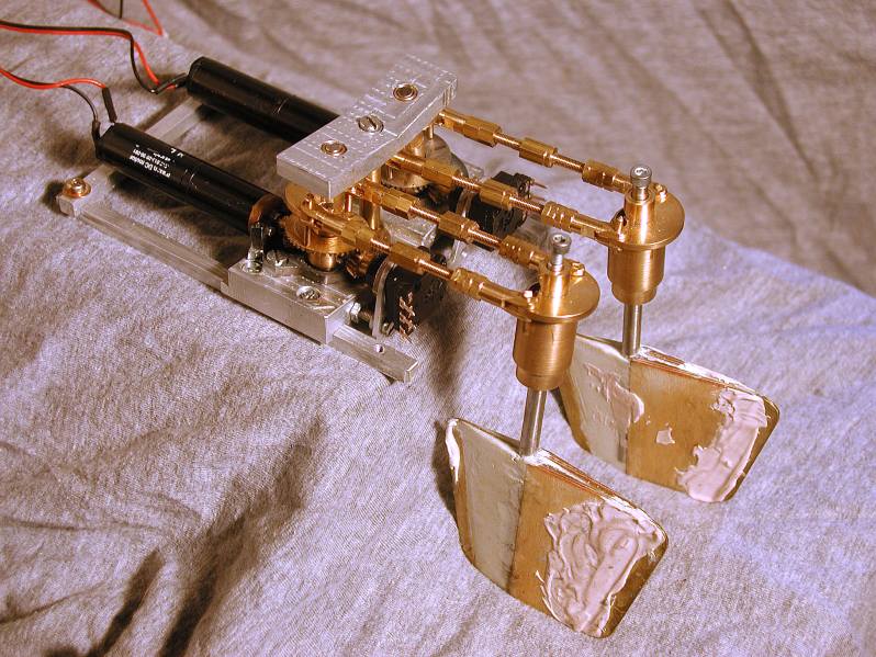 Mitte 2002 Dies ist die Rudermaschine. Kpl. selbst entworfen und gebaut in Alu und Messing.Mit 2 seeeeehr starken Maxon Getriebemotoren (alle Teile vom Schrott). Einfach nen Servo reinsetzen kann ja jeder *grins* (wozu hab ich sonst Maschinenschlosser gelernt) |