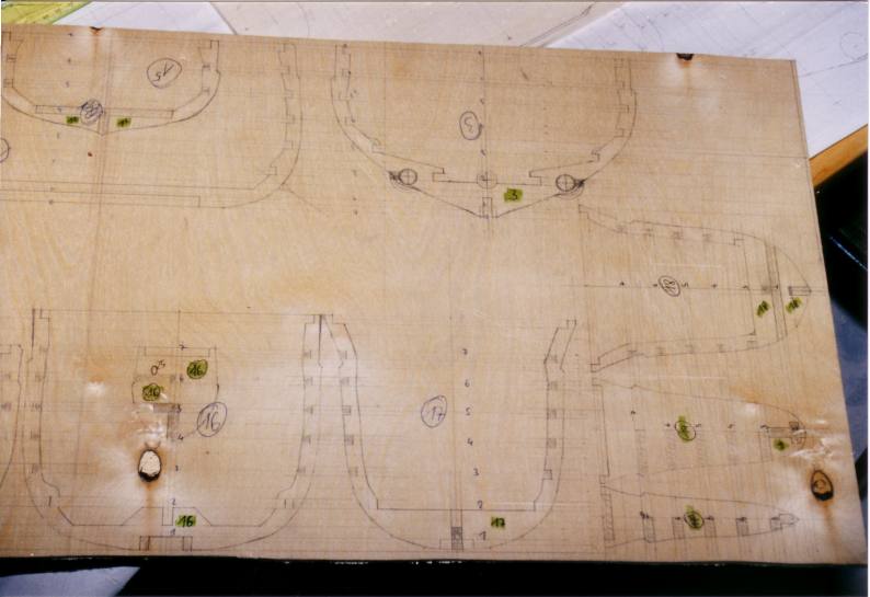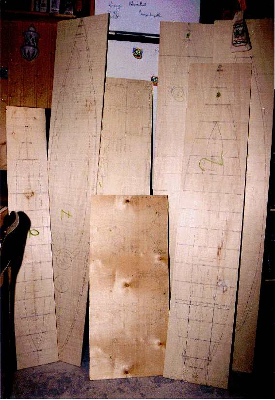 Eine sch... Arbeit, jeden Spant einzeln aufzeichnen, und da nicht nur die herkömmlichen Spanten sondern auch horizontale (Linienrisse), Aussparungen und Verbindungsstellen einzeichnen und mit der Hegner ausschneiden. Und schlieslich alles zusammensetzen und kräftig in Epoxidharz tauchen.Schaut schon lustig aus so ein Spantengerüst, man könnte fast sagen wie bei einem echten Schiff. |