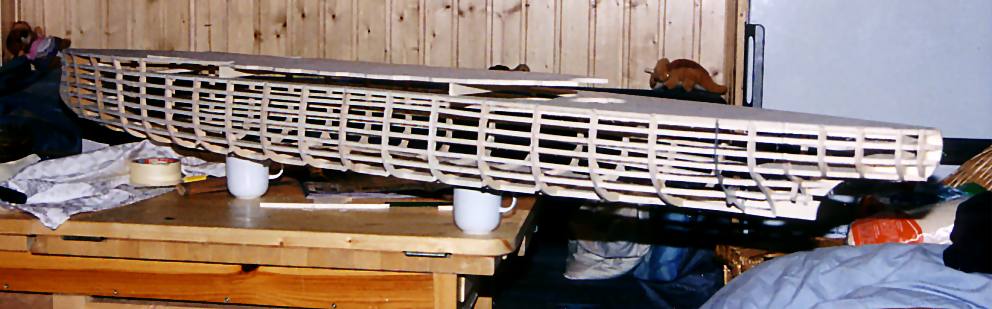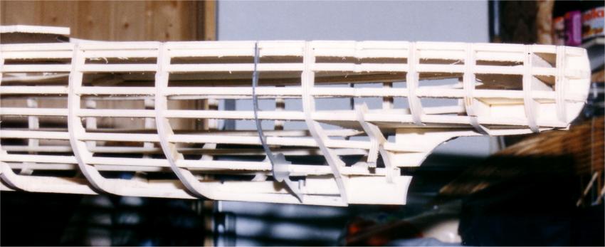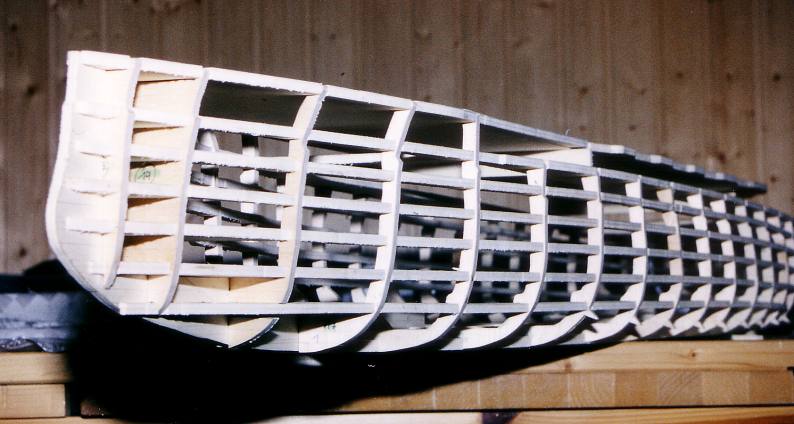 Besonderheit bei meiner Bauweise: Das Gerüst ist freitragend,ohne Hellingbrett.Dadurch ist es leichter zum handhaben, vor allem kommt man jederzeit in den Innenraum, was für meine Bauweise wichtig ist.Nachteil: Mehr Arbeitsaufwand bei den Spanten.. |